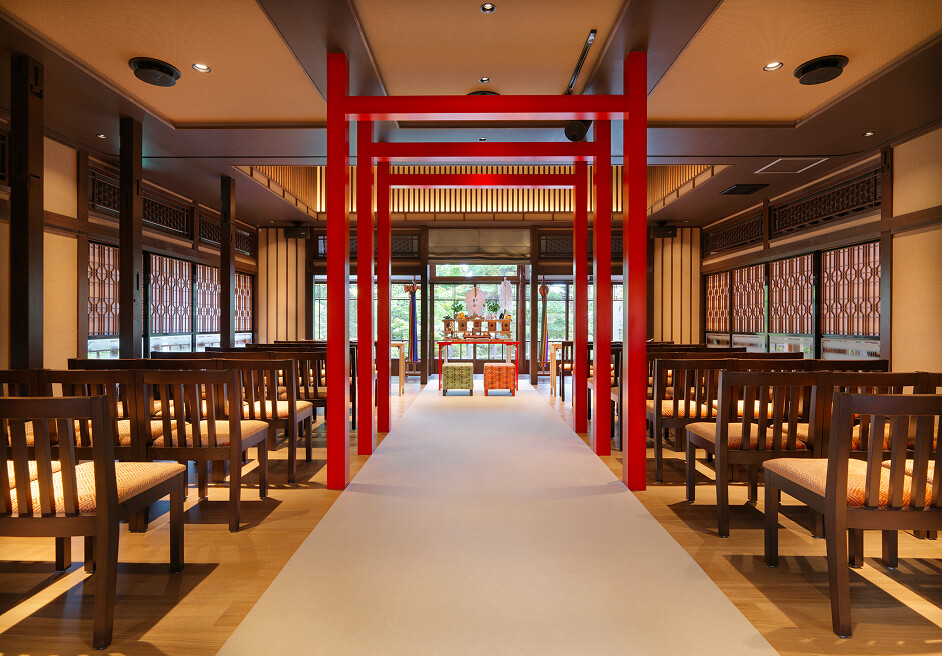 館内の奥に位置する神殿は、他には類を見ないモダンな造り。鳥居を思わせる朱赤のあしらいが印象的です。正面には庭園の緑を眺め、まるで本物の神社での挙式のように厳かであり温かくもある神前式を叶えられます。⼟⽣⽥神社の宮司がおふたりの挙式を執り行います。