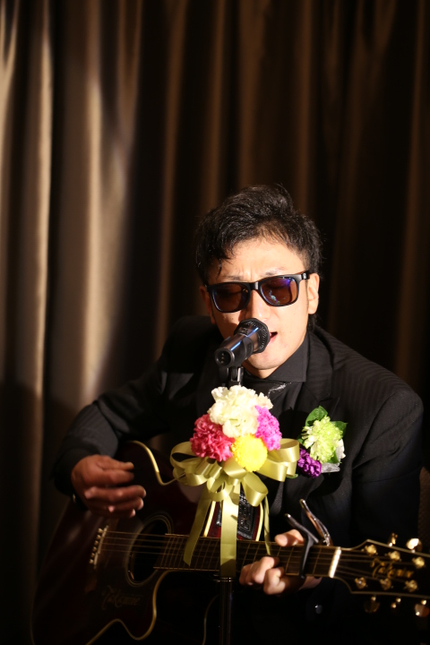新郎友人余興も負けてはおりません!ロビンソン吉井さんがハーモニカを吹きながら出てきたと思ったら、ギターを片手に一曲披露!