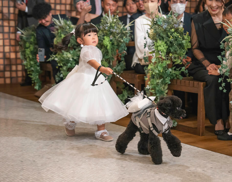 おふたりが家族となる誓いだからこそ、その一員であるペットも一緒に参加してもらいましょう。ゲストとして参列するもよし、挙式のお手伝いをしてもらうもよし。緊張しそうな挙式も、愛くるしいペットの様子を見ると自然体で居られます。