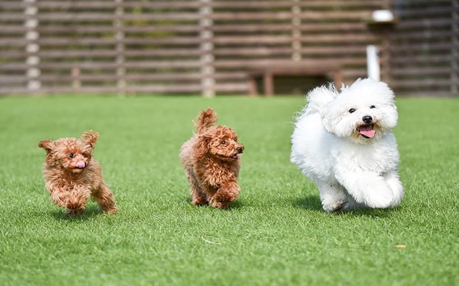 青空の下のガーデンテラスに芝を引き詰ればペットもリラックス。